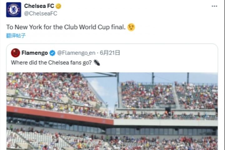 弗拉門戈小組賽3-戰(zhàn)勝切爾西,當(dāng)時他們球隊社媒曬照嘲諷:“切爾西球迷們要去哪?”切爾西今天也在社媒轉(zhuǎn)發(fā)回應(yīng):“去紐約參加世俱杯決賽???!?/p>