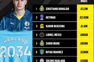 體育資訊01月17日訊 哈蘭德與曼城簽下長達10年的新合約,基礎周薪也漲到50萬鎊,英媒talkSPORT盤點了目前足壇6名僅有的周薪高于哈蘭德的球員,他們幾乎都效力于沙特聯(lián)賽。