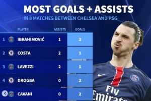 3球:伊布(巴黎,2球1助攻)、迭戈-科斯塔(切爾西,1球2助攻)、拉維奇(巴黎,1球2助攻)