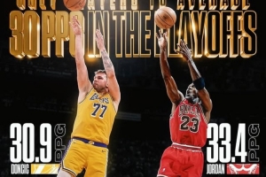 喬丹生涯179場季后賽,場均33.4分;東契奇55場季后賽,場均30.9分。