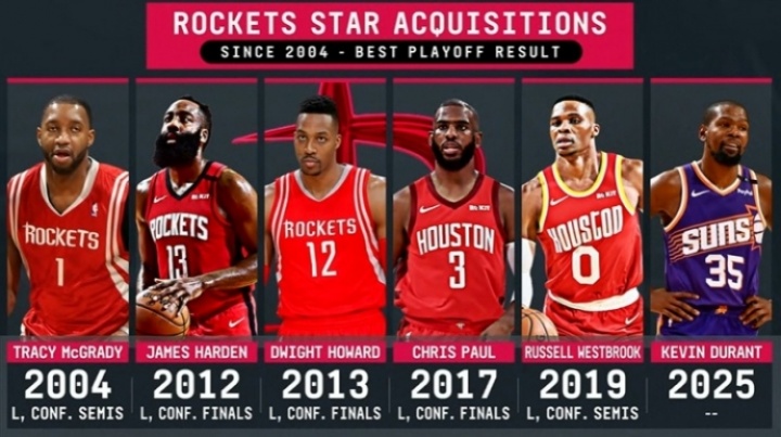 體育資訊07月20日訊 官方轉(zhuǎn)播曬出了火箭21世紀(jì)以來球隊做的球星交易以及他們帶領(lǐng)球隊在季后賽達(dá)到的最好成績: