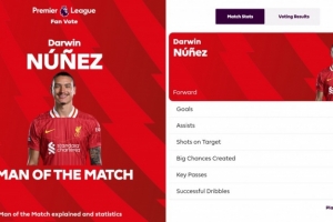 體育資訊1月19日訊 英超第22輪,努涅斯補時梅開二度,利物浦2-0絕殺布倫特福德。賽后,努涅斯毫無懸念地當選了全場最佳球員。