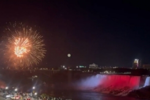 美國(guó)知名地標(biāo)尼亞加拉瀑布也亮燈紅、黑、白三色并燃放煙花,歡迎曼聯(lián)造訪美國(guó)。