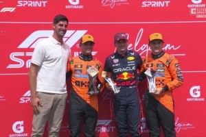 庫(kù)爾圖瓦現(xiàn)場(chǎng)觀看F1比利時(shí)大獎(jiǎng)賽,并與沖刺賽領(lǐng)獎(jiǎng)臺(tái)車手維斯塔潘、皮亞斯特里、諾里斯合影。