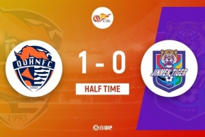 傷停補(bǔ)時(shí)8分鐘。上半場比賽結(jié)束,青島海牛1-0天津津門虎。