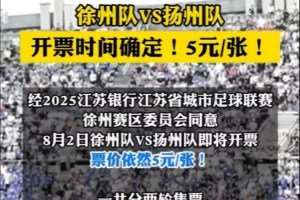 體育資訊7月29日訊 今天《揚(yáng)州晚報(bào)》報(bào)道,8月2日徐州隊(duì)VS揚(yáng)州隊(duì)的門票即將開(kāi)票,票價(jià)依然5元/張。