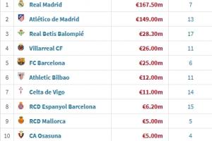 皇馬、馬競之后,排名第三的貝蒂斯目前只花費了2830萬歐,第四的比利亞雷亞爾花費2600萬歐。巴薩2500萬歐暫排第五,引進了胡安-加西亞和拉什福德。