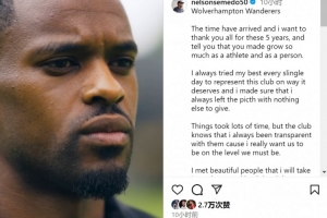體育資訊7月31日訊 狼隊(duì)邊衛(wèi)塞梅多將加盟費(fèi)內(nèi)巴切,他更新社媒動(dòng)態(tài),與狼隊(duì)告別。