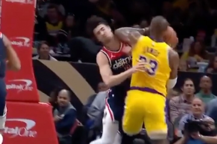 2024年4月,湖人客場挑戰(zhàn)奇才,詹姆斯轉(zhuǎn)身肘到阿夫迪亞腦袋,從進(jìn)攻犯規(guī)升級一級惡意犯規(guī)。