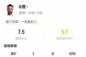 體育資訊1月20日訊 2024-25賽季英超聯(lián)賽第22輪,曼聯(lián)1-3不敵布萊頓。B費本場比賽首發(fā)出戰(zhàn),打進1粒點球,送出1次關(guān)鍵傳球,但也有全場最多的20次丟失球權(quán),評分7.5。