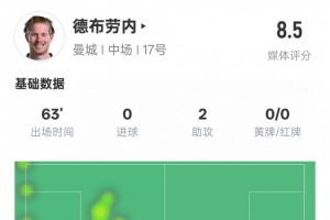 體育資訊1月20日訊 英超第22輪,曼城對(duì)陣伊普斯維奇,德布勞內(nèi)首發(fā)出戰(zhàn),送出2次助攻,3次關(guān)鍵傳球,但也有17次丟失球權(quán),評(píng)分8.5。
