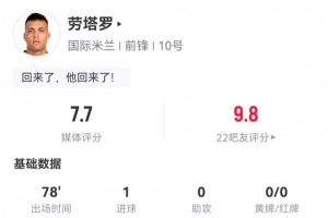 體育資訊1月20日訊 本輪意甲,國米主場3-1恩波利。此役勞塔羅首發(fā)78分鐘被換下,球員全場重點數(shù)據(jù)如下↓