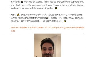 京多安在微博發(fā)文:“大家好??,我是伊爾卡伊-京多安!很高興在這里與大家見面。未來我將在微博與大家分享我的足球歷程??和生活點(diǎn)滴??。感謝每一位支持我的朋友,期待與你們的互動(dòng)!請(qǐng)關(guān)注我的官方微博,一起分享更多精彩時(shí)刻!??”
