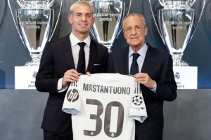 體育資訊8月14日訊 北京時間今晚19點,皇馬新援馬斯坦托諾在皇馬正式亮相?;蜀R主席弗洛倫蒂諾在新聞發(fā)布會上談到了從河床簽下的馬斯坦托諾。