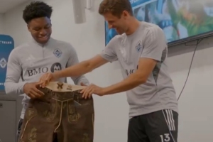 體育資訊8月16日訊 溫哥華白浪曬出視頻,穆勒給為自己讓出號(hào)碼的隊(duì)友普里索送了巴伐利亞傳統(tǒng)服飾。