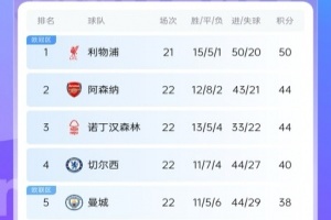 最新英超積分榜形勢如圖所示: