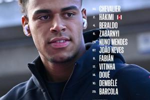 30-舍瓦利耶、2-阿什拉夫、4-貝拉爾多、6-扎巴爾尼、25-努諾-門德斯、87-若昂-內(nèi)維斯、8-法比安-魯伊斯、17-維蒂尼亞、14-杜埃、10-登貝萊、29-巴爾科拉