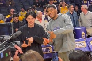 賽前,最近加盟MLB道奇隊的日本天才棒球手佐佐木朗希與老鄉(xiāng)八村塁見面,后者教其比出LA的手勢。