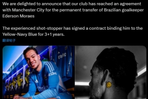“我們非常高興地宣布,俱樂部已與曼城就巴西門將埃德森的永久轉(zhuǎn)會達成協(xié)議。這位經(jīng)驗豐富的門將已與我們簽署了一份3+1合同?!?/p>