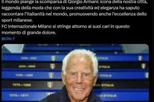 國(guó)米官方寫(xiě)道:“全世界都在為喬治-阿瑪尼的離世而哀悼:他是我們城市的象征,是時(shí)尚界的傳奇人物,以其創(chuàng)意與優(yōu)雅將意大利精神傳遞到全世界,同時(shí)也推廣了米蘭城體育的卓越形象。”