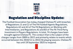 英格蘭足球總會(huì)今日對(duì)切爾西足球俱樂部提出指控,其違反《英足總足球經(jīng)紀(jì)人條例》J1和C2條款、《英足總中介合作條例》A2和A3條款,以及《英足總第三方球員投資條例》A1和B3條款。切爾西俱樂部共面臨74項(xiàng)指控,涉及2009年至2022年期間的違規(guī)行為,主要集中于2010/11至2015/16賽季期間。切爾西俱樂部需于2025年9月19日前就此作出回應(yīng)。