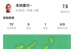體育資訊1月23日訊 米蘭在本輪歐冠1-0領先赫羅納,本納塞爾本場數(shù)據(jù)如下: