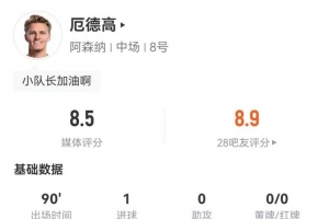 體育資訊1月23日訊 阿森納在本輪歐冠3-0大勝薩格勒布迪納摩,厄德高本場數(shù)據(jù)如下: