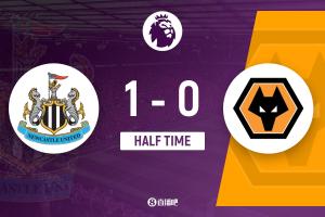 上半場比賽結(jié)束,紐卡斯爾聯(lián)1-0狼隊。