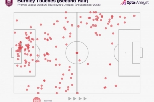 據(jù)統(tǒng)計,伯恩利在本場比賽下半場沒有一次在利物浦禁區(qū)內(nèi)觸球,而利物浦則有41次對手禁區(qū)觸球,最后一次就是薩拉赫的點射絕殺。