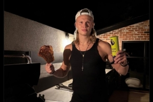 賽后這名前鋒更新社媒,一身休閑裝扮,手拿烤肉與英超官方全場最佳球員獎杯。