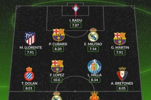 體育資訊9月16日訊 本輪西甲戰(zhàn)罷,數(shù)據(jù)網(wǎng)站W(wǎng)hoscored也評(píng)出本輪西甲最佳陣,具體如下:
