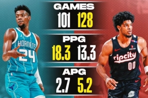 美媒Cluthpoints曬圖,對(duì)比了2023年榜眼米勒和探花亨德森的數(shù)據(jù),米勒出戰(zhàn)101場(chǎng),場(chǎng)均18.3分2.7助攻4.4籃板,命中率42.8%,亨德森出戰(zhàn)128場(chǎng),場(chǎng)均13.3分5.2助攻3.1籃板,命中率40.1%,并寫(xiě)道: