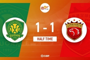 傷停補時6分鐘。上半場比賽結(jié)束,北京國安1-1上海海港。