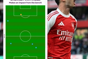 體育資訊9月22日訊 英超官方發(fā)布數(shù)據(jù),馬丁內(nèi)利替補(bǔ)登場后僅觸球5次,便為阿森納1-1逼平曼城。
