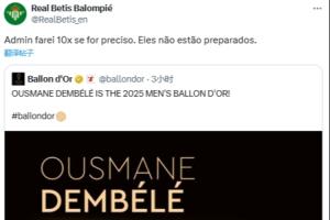 體育資訊09月23日訊 2025金球獎(jiǎng)由巴黎球員登貝萊斬獲,貝蒂斯轉(zhuǎn)發(fā)球員獲獎(jiǎng)的動(dòng)態(tài)并表示:若有必要小編我會(huì)發(fā)十遍,他們還沒準(zhǔn)備好。