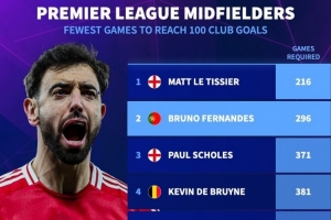據(jù)德國(guó)轉(zhuǎn)會(huì)市場(chǎng)統(tǒng)計(jì),B費(fèi)已為曼聯(lián)打進(jìn)100球,英超時(shí)代只有8名中場(chǎng)球員為俱樂(lè)部(所有賽事)打進(jìn)100球,而B(niǎo)費(fèi)是所用場(chǎng)次第2少的中場(chǎng)球員。
