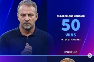 自執(zhí)教巴薩以來,弗里克已經(jīng)帶隊(duì)進(jìn)行了67場比賽,取得50勝8平9負(fù)的戰(zhàn)績,接近執(zhí)教拜仁63場50勝的數(shù)據(jù)。