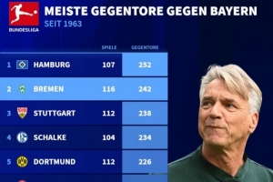體育資訊9月26日訊 本周五晚拜仁即將在主場迎戰(zhàn)不萊梅,德國轉(zhuǎn)會市場網(wǎng)統(tǒng)計了德甲成立以來面對拜仁丟球數(shù)最多的10支球隊,其中漢堡排名第一,不萊梅就位居第二。