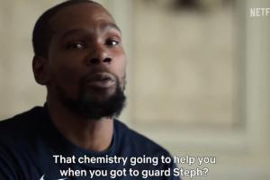 鏡頭一轉(zhuǎn),給到杜蘭特,他說(shuō):“OK,行吧,那你們的化學(xué)反應(yīng)在防守庫(kù)里的時(shí)候起到幫助作用了嗎?”