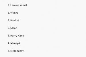 體育資訊09月27日訊 隊報公布了2025年金球獎各國記者的投票詳情,其中韓國記者將前三順位選票投給了登貝萊、亞馬爾、維蒂尼亞,姆巴佩位列第7,佩德里未能進入前10。
