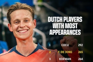 據(jù)巴薩官方數(shù)據(jù)統(tǒng)計(jì),弗蘭基-德容為巴薩出戰(zhàn)場(chǎng)次已經(jīng)達(dá)到265場(chǎng),超越羅納德-科曼,成為代表巴薩出戰(zhàn)場(chǎng)次第二多的荷蘭球員,僅次于292場(chǎng)的科庫(kù)。