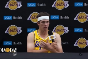 你知道,今天是我自從我們被明尼蘇達(dá)淘汰后第一次見到他,因?yàn)橘惣窘Y(jié)束后我基本上就“消失”了,我回老家了,而他一直在旅行,每次你見到他,他臉上都帶著燦爛的笑容,他是房間里最像大孩子的人,玩得很開心,你知道,對(duì)于一位已經(jīng)征戰(zhàn)了這么久的球員來說,你能感受到這一點(diǎn)真的很可貴。