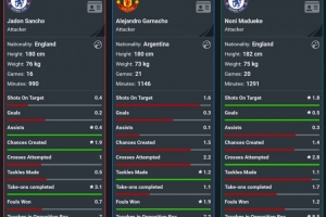 桑喬(曼聯(lián)外租切爾西,16場(chǎng)):場(chǎng)均0.4次射正、打進(jìn)0.2球,助攻0.4次、創(chuàng)造機(jī)會(huì)1.9次、嘗試傳中1次,搶斷0.5次、成功過(guò)人3.1次,造犯規(guī)0.7次、對(duì)方禁區(qū)內(nèi)觸球7次