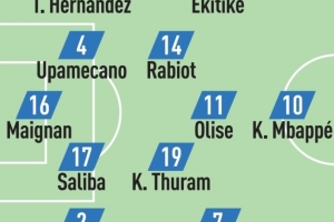 隊(duì)報預(yù)測法國隊(duì)首發(fā):邁尼昂;特奧、于帕梅卡諾、薩利巴、古斯托;拉比奧特、K-圖拉姆、?;倏?、奧利塞、科曼;姆巴佩