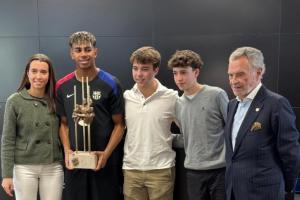 體育資訊1月25日訊 根據(jù)巴薩官網(wǎng)消息,巴薩球員亞馬爾、邦馬蒂領取了由羅維拉家族贈送的阿爾多-羅維拉最佳球員獎杯。