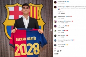杰拉德-馬丁也通過(guò)社媒曬出自己手持印有2028字樣的巴薩球衣照,并配文:“我對(duì)自己能夠獲得續(xù)約合同感到非常自豪和高興,將繼續(xù)捍衛(wèi)胸前的紅藍(lán)隊(duì)徽并實(shí)現(xiàn)夢(mèng)想?!?/p>