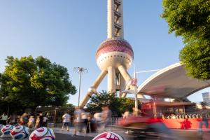 近日,2026年FIFA世界杯官方比賽用球“三重浪”來(lái)到上海東方明珠廣播電視塔,開啟限時(shí)亮相活動(dòng)。