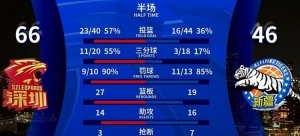 體育資訊1月25日訊 CBA常規(guī)賽,深圳半場(chǎng)66-46領(lǐng)先新疆達(dá)20分。