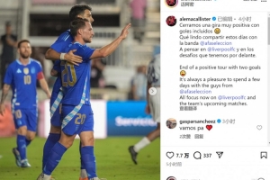 麥卡利斯特社媒曬出比賽照片,并寫道:“以兩粒進(jìn)球結(jié)束了積極的國際比賽日之旅,與國家隊伙伴們共度數(shù)日時光總是令人感到愉快?!?/p>