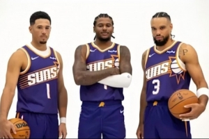 上上季太陽(yáng)有布克、格雷森·阿倫、比爾和埃里克·戈登四個(gè)2號(hào)位,中鋒是努基奇和206公分的尤班克斯。